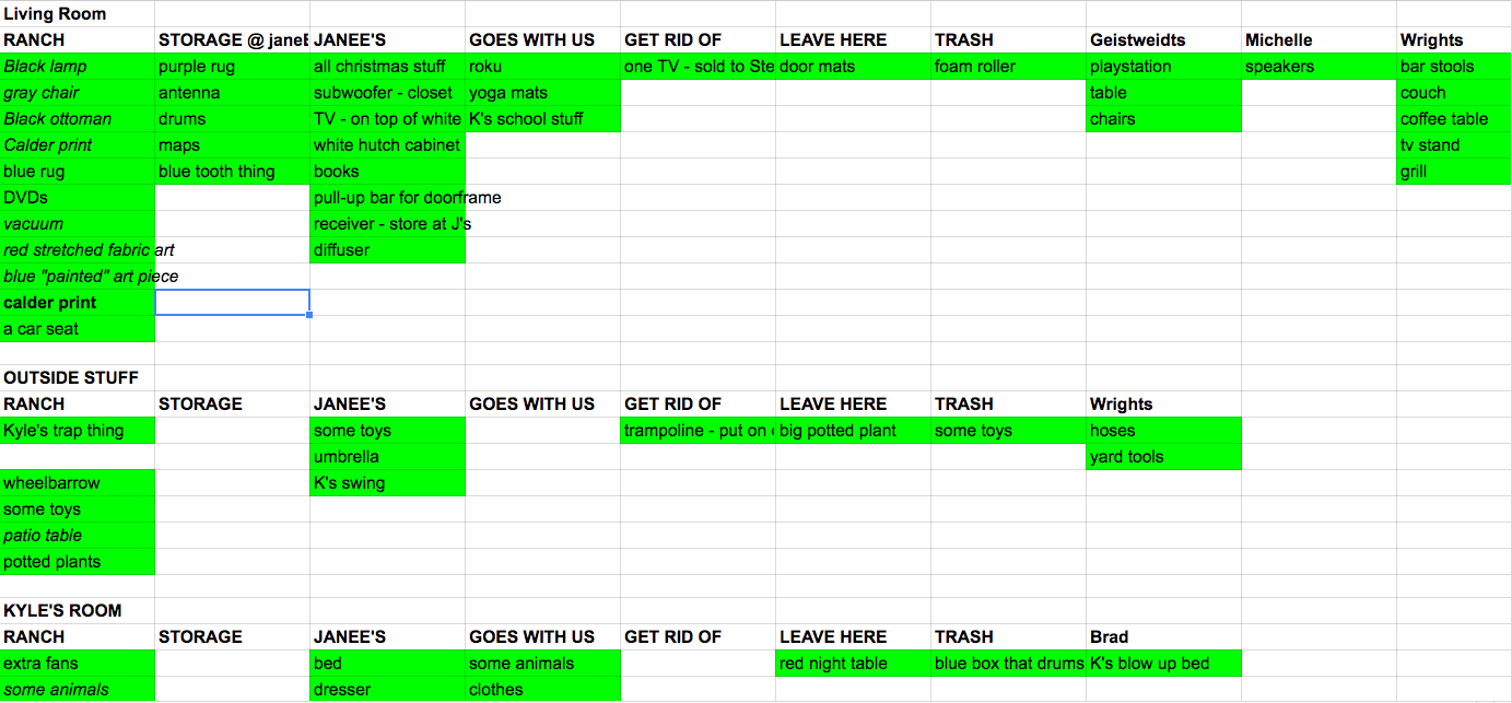 Okay, the real process of getting everything organized involved a massive, color coded spreadsheet. I went room by room, drawer by drawer, furniture piece by furniture piece, pile by pile, and made list after list after list until I was blue in the face.